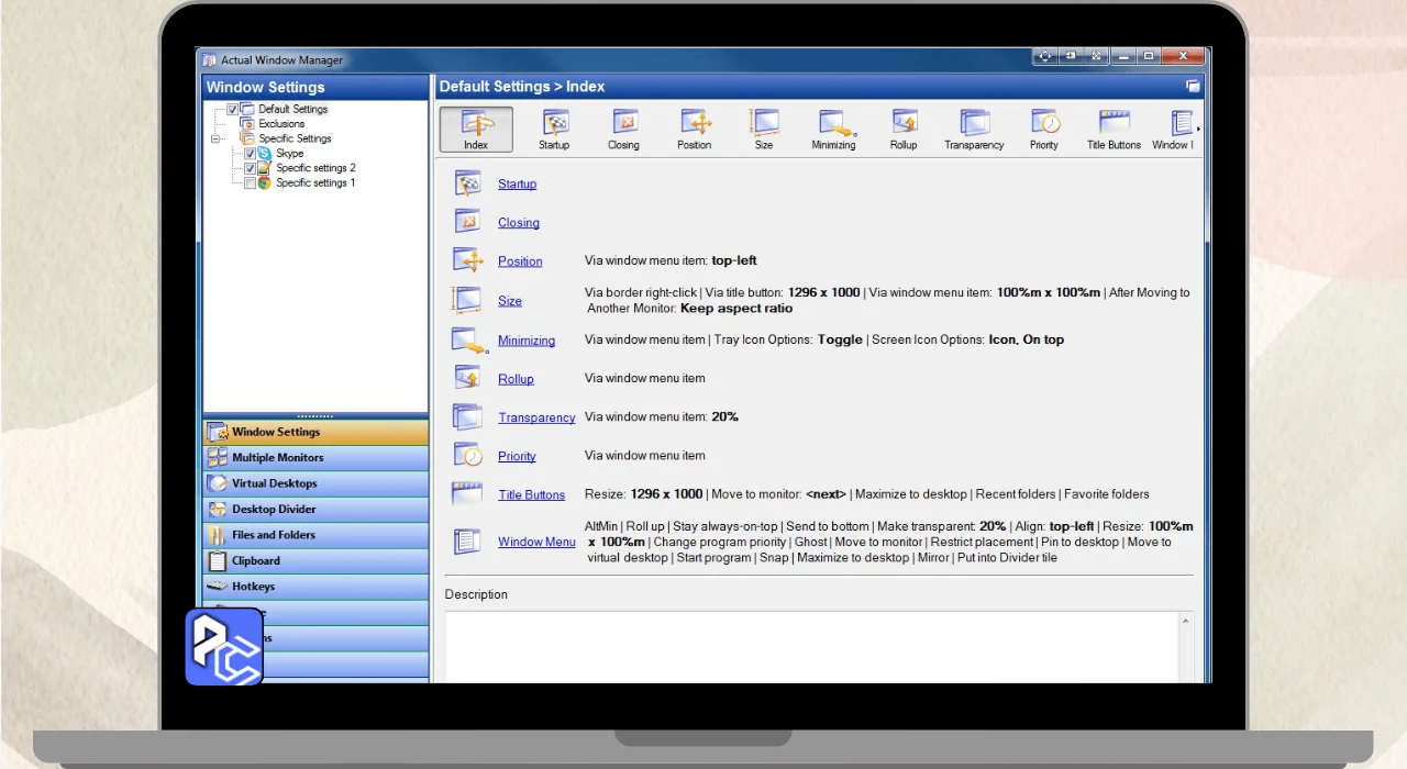 Actual Window Menu is a Software that Helps you manage and Organize the windows on your computer. It Adds Extra Buttons to Each Window, Giving You More Control. You can roll up windows to just the title bar, make them transparent, resize them, or pin them to stay on top of other windows.