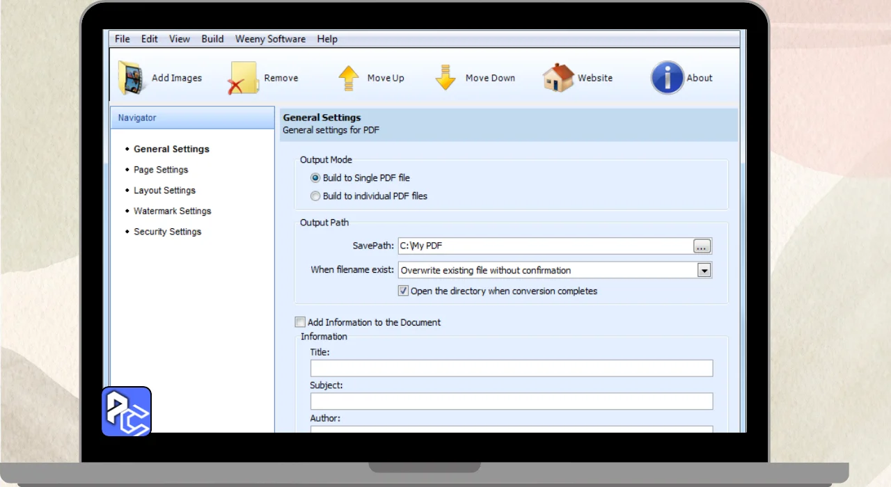 - Allows customization of PDF metadata (title, author, etc.).