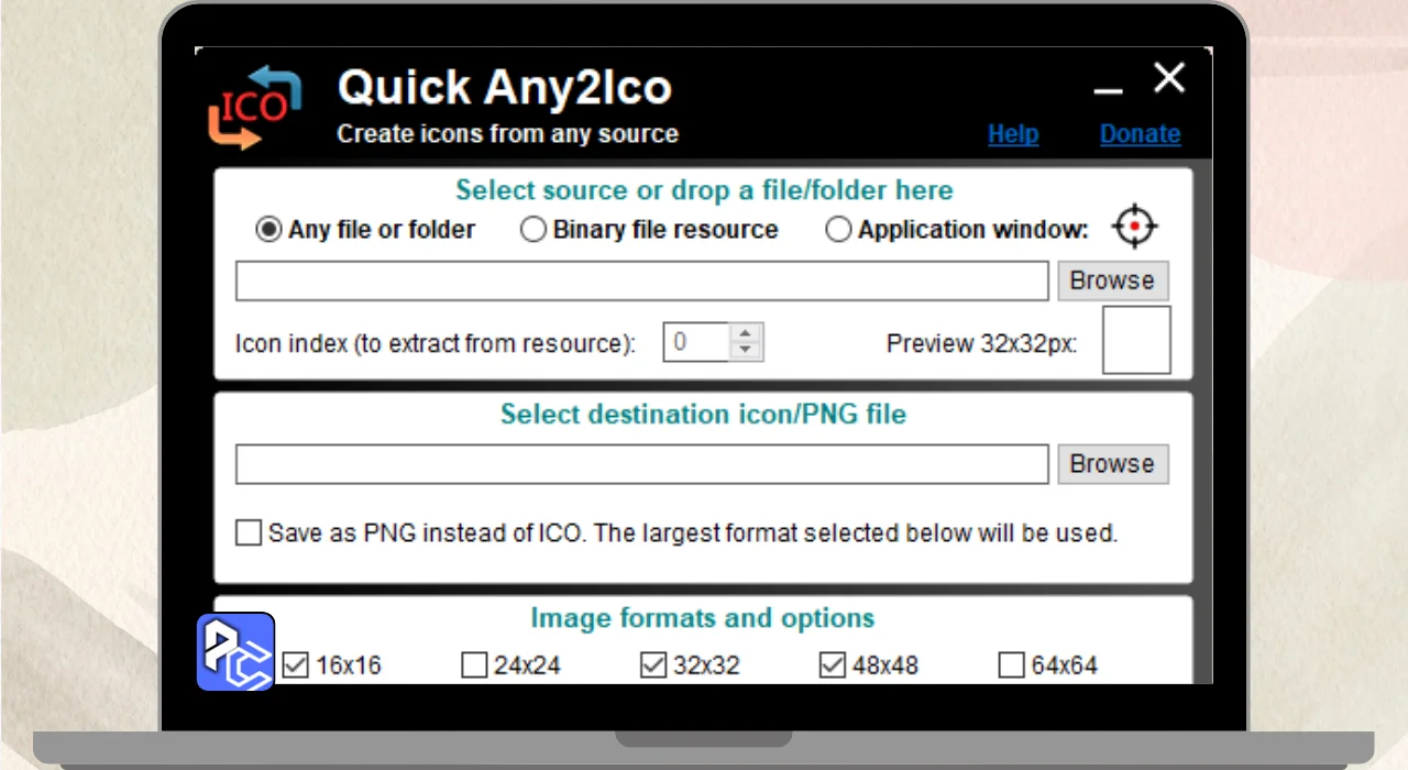 Quick Any2Ico is a user-friendly tool that converts icons from various file formats into PNG or GIF images. It allows you to easily choose an icon file, select your desired format, and pick a size. This makes it Useful for Quickly Preparing icons for different Uses.