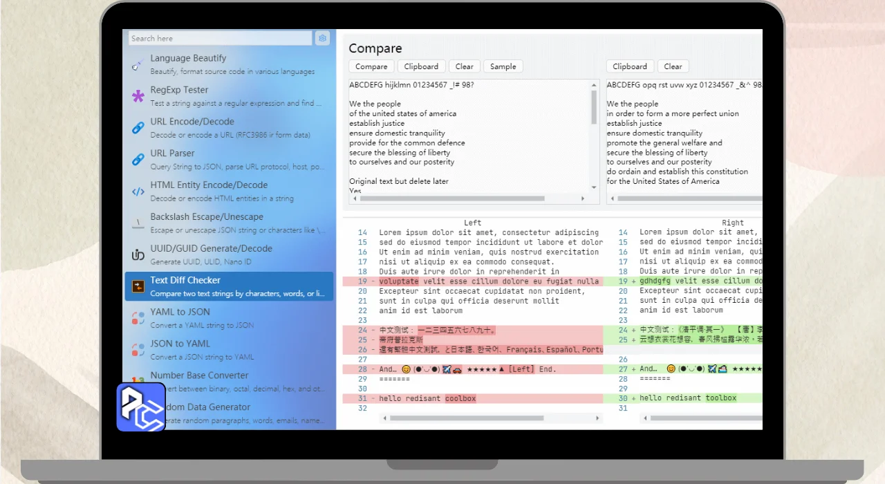 - Text Difference Comparison: Highlights changes between two pieces of text.