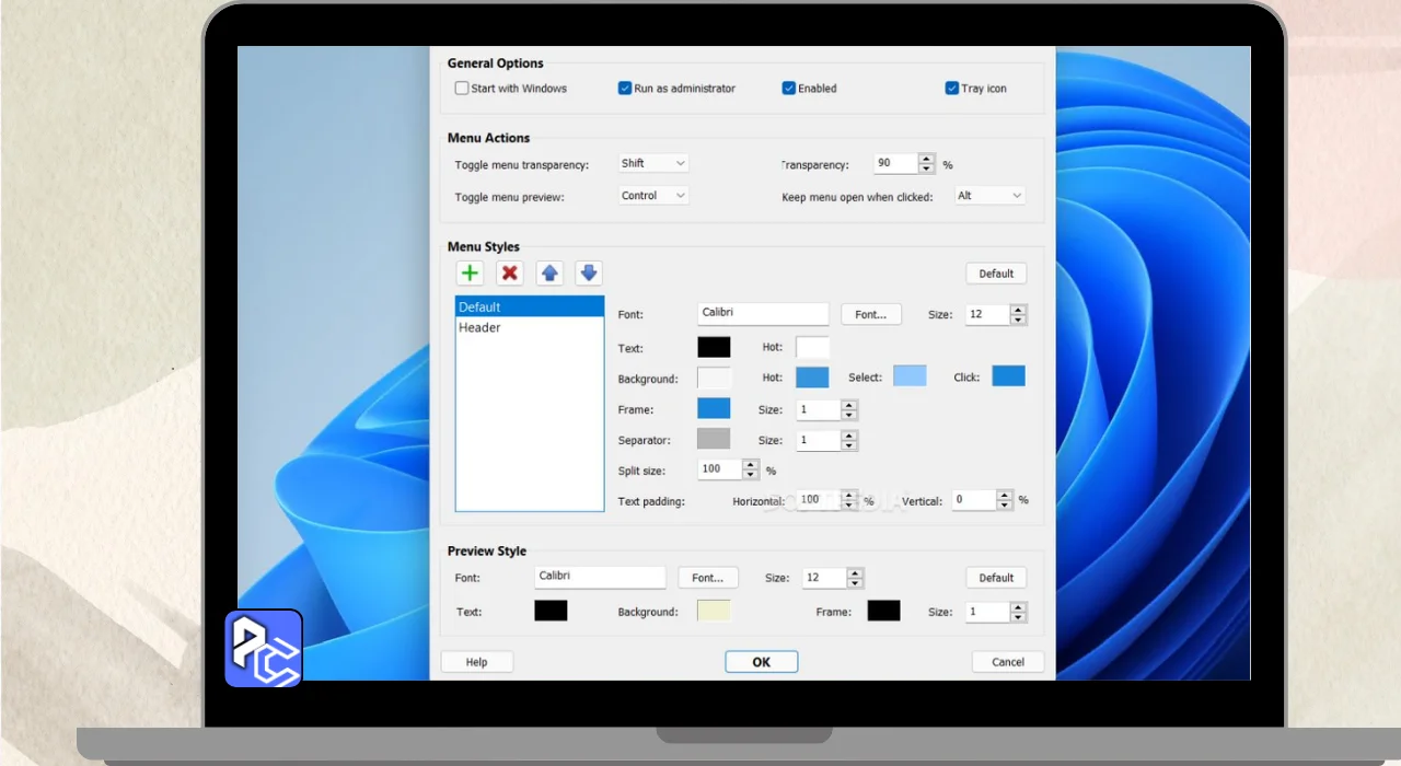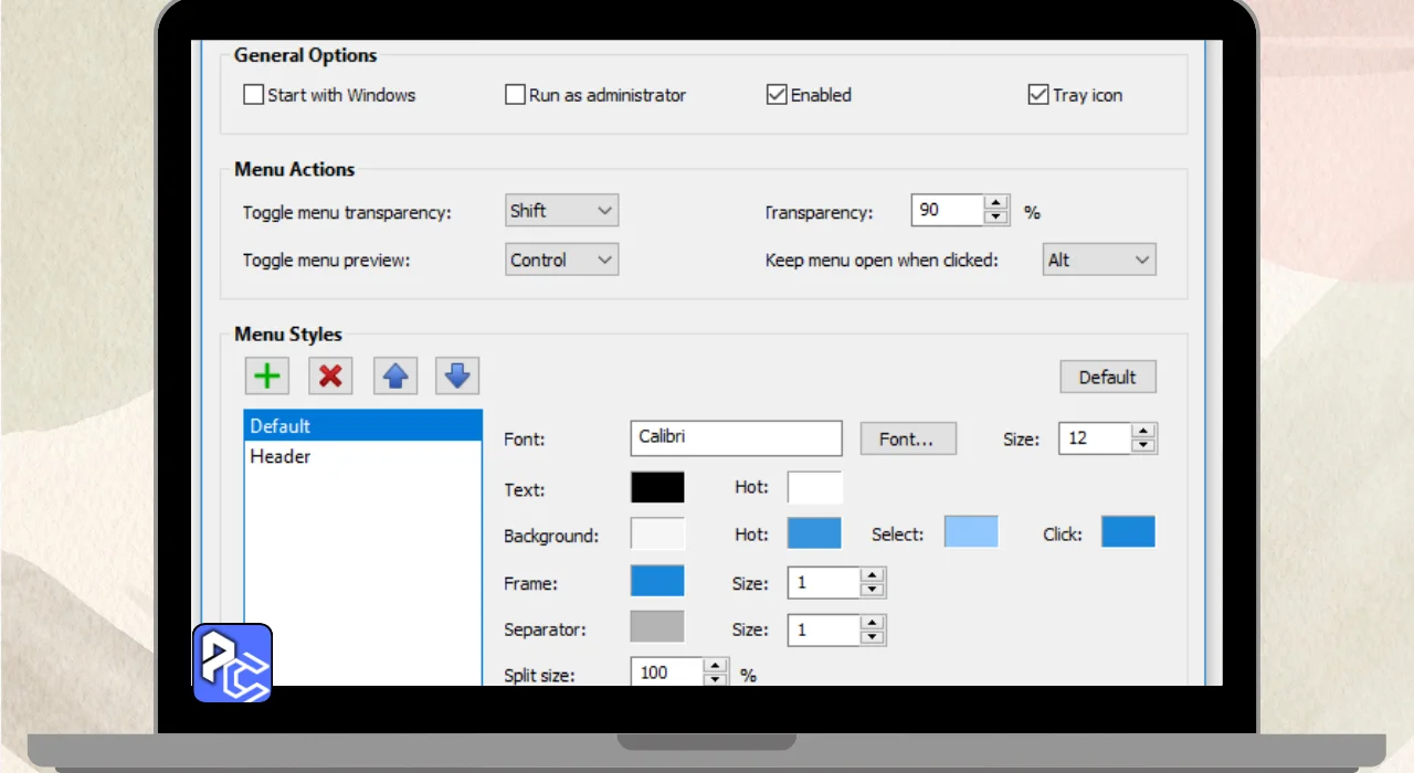 - Customizable menu appearance with adjustable fonts, colors, and transparency.
